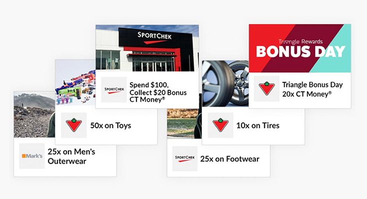 *BONUS OFFER EXPIRES: within 30 days of approval of the Triangle credit card. The Triangle credit cards are issued by Canadian Tire Bank. The Triangle Rewards Program is owned and operated by Canadian Tire Corporation, Limited. Rewards are in the form of electronic Canadian Tire Money® (CT Money®). Terms and conditions apply to collecting and redeeming. Visit triangle.com for more information. This offer applies on approval for the Triangle Mastercard or Triangle World Elite Mastercard. Not valid in conjunction with any other coupon, offer, discount or previous purchases excluding the Canadian Tire Bank 4% everyday offer.11% Bonus Canadian Tire Money will be added to your Triangle Rewards account when the Triangle Mastercard or Triangle World Elite Mastercard is activated and a purchase is made at a Canadian Tire, Sport Chek, Atmosphere, Mark's, L'Equipeur, Sports Rousseau, Hockey Experts, L'Entrepot du Hockey or participating Sports Experts stores before the offer expiry date. Purchases at Canadian Tire gas bars are not eligible for this offer. Bonus Canadian Tire Money can be redeemed on any eligible future purchases provided your account is in good standing. Valid in-store only. CT Money is collected on the pre-tax amount of the purchase. The 11% CT Money bonus will appear on your Triangle Rewards account within 5 days.