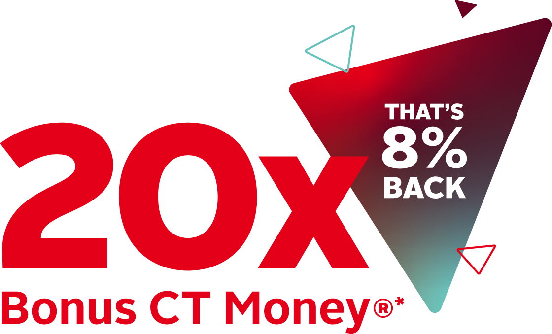 * The Triangle Rewards Program is owned and operated by Canadian Tire Corporation, Limited. Triangle® credit cards are issued by Canadian Tire Bank. Rewards are in the form of electronic Canadian Tire Money® (CT Money®). To collect bonus CT Money you must present a Triangle Rewards card/key fob, or use any approved Cardless method, at time of purchase or pay with a Triangle credit card. You cannot collect paper Canadian Tire Money on bonus offers. Any bonus multiplier is based on the base rate of collecting CT Money (0.4%), and will be added to whatever the Member would otherwise collect, without the bonus. Example: On a $100 (pre-tax) purchase with a 20x bonus multiplier a Member would earn a bonus $8 in CT Money (20 X .4% X $100). Not all items sold are eligible to earn CT Money or to be redeemed for. Conditions apply. Visit triangle.com for full program rules and Partner location information. The offered rate is exclusive of any bonus or promotional offers or redemption transactions. CT Money is collected on the pre-tax amount of the purchase. Bonus CT Money may take up to 5 weeks to be applied to the Member’s Triangle Rewards Account. No rainchecks. Single use only per Triangle Rewards Account.